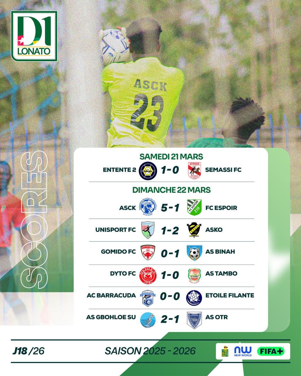 Le championnat togolais de football de première division était à sa 18e journée ce week-end au Togo. Samedi, Entente II de Lomé a pris le meilleur sur Semassi de Sokode sur la plus petite des marges.