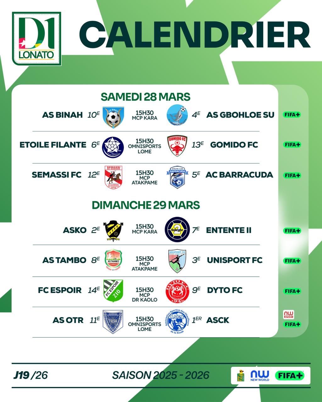Dans cette même journée de samedi, Semassi de Sokode offre son hospitalité à l’AC Barracuda de Lomé. Le reste des rencontres de cette 19e journée de championnat, a lieu dimanche.