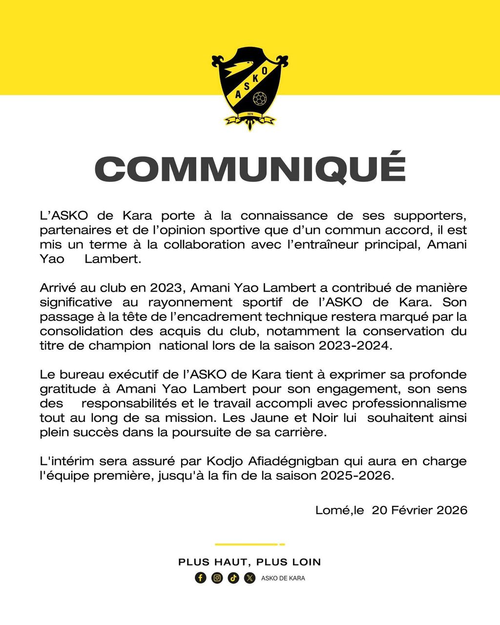 Lambert Amani n’est plus le coach des Kondona de la Kozah. Cette formation a annoncé, à travers un communiqué en date de ce vendredi 20 février 2026 qu’elle mettait un terme à la collaboration avec le technicien ivoirien.