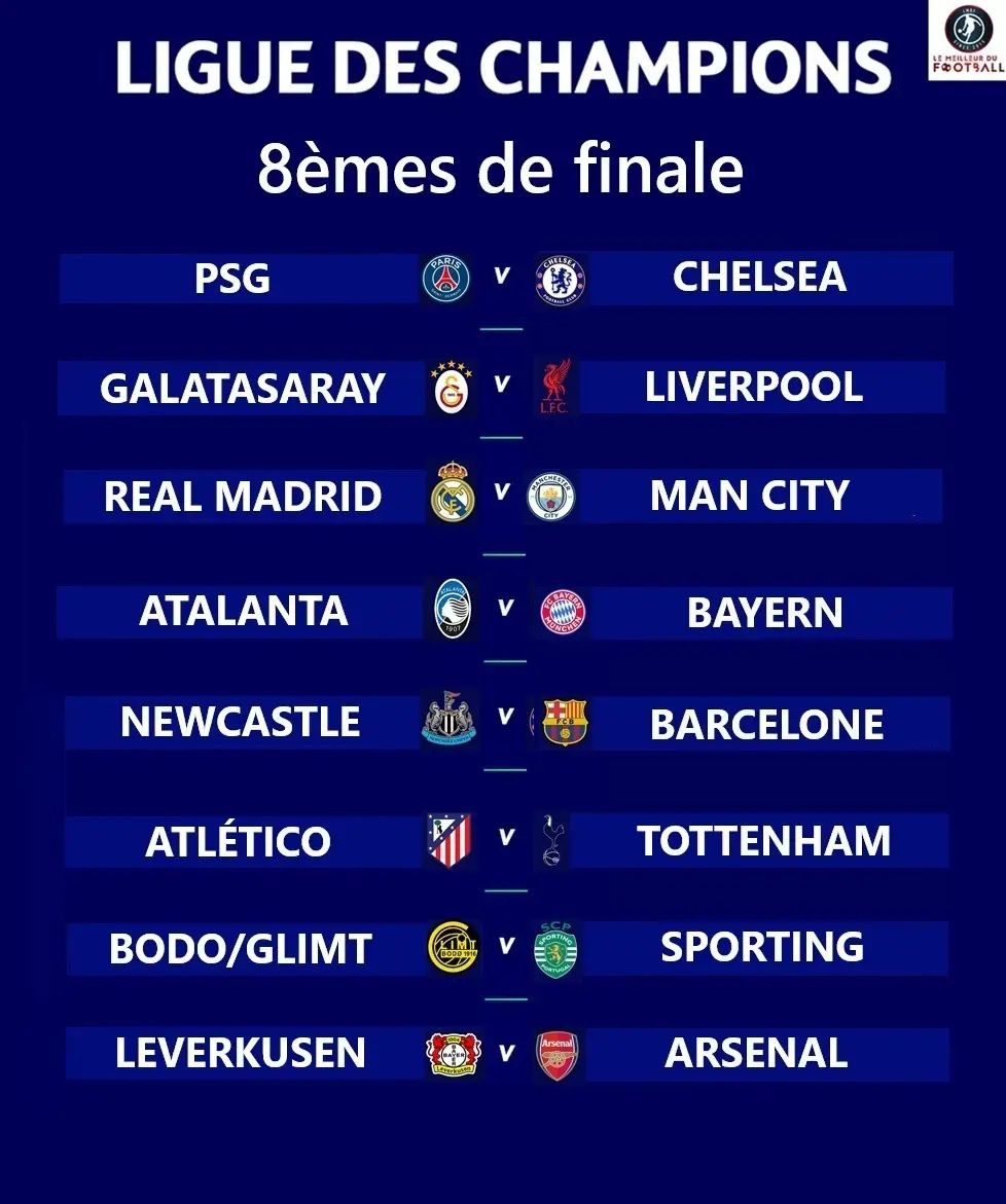 Le champion en titre, le Paris Saint Germain est opposé aux Blues de Chelsea. Galatasaray affronte Liverpool alors que le surprenant Bodo Glimt croise les crampons avec les Portugais du Sporting.