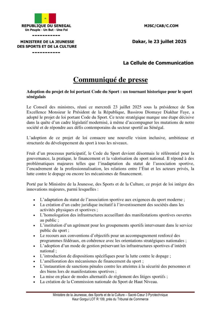 Afin de moderniser la législation sportive et répondre efficacement aux défis de l’heure dans le domaine du sport, un code du sport à été adopté au Sénégal par le conseil des ministres, sous la supervision du président Bassirou Diomaye Faye ce jeudi 24 juillet.